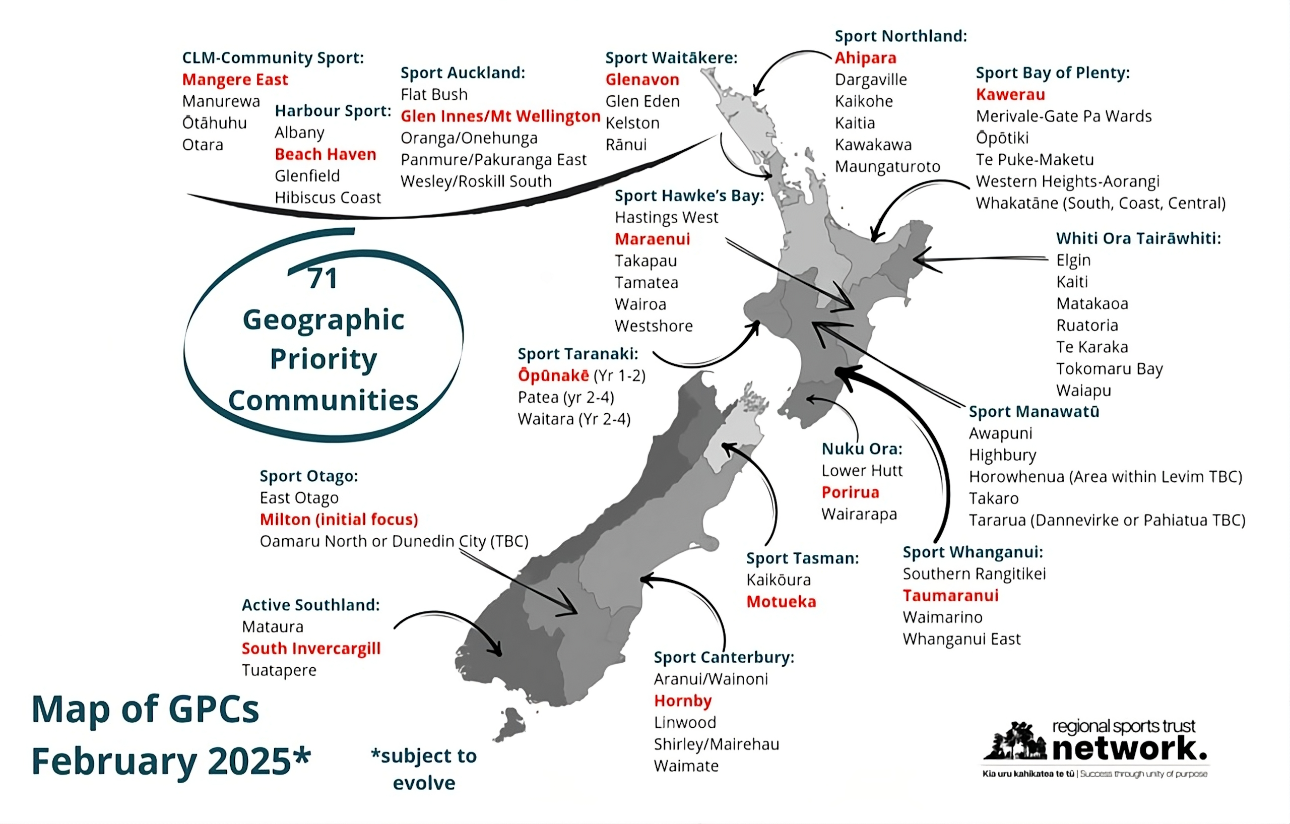 A GPC is an area into which an organisation will prioritise its workforce and resources. GPCs are identified as areas that contain priority populations that align with the organisation’s strategy. These may include specific ethnic populations (e.g., Māori, Pasifika, Asian etc.), specific age groups (e.g., tamariki and rangatahi), those living in low socioeconomic areas, disabled individuals or more generally those more likely to miss out on opportunities to be active.